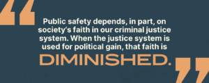 This is a dangerous departure from institutional norms that have existed since Watergate to maintain separation between the Department of Justice and the White House on issues involving criminal investigations. Further, politicizing federal prosecutorial powers threatens to undermine public trust in the legal system and, ultimately, public safety. For the rule of law to stand, it requires a shared belief and common understanding that bad actors who intentionally cause harm will be held accountable and punished accordingly. If the federal criminal system is used to punish political enemies, it is delegitimized. It becomes another tool for the President to pick winners and losers, to quash dissent, and eliminate political competition. Public safety depends, in part, on society’s faith in our criminal justice system. When the justice system is used for political gain, that faith is diminished.